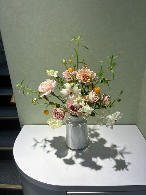 ひらひらとした花びらとやさしい色合いが、空間にやわらかな風を運ぶような印象を与えてくれます。